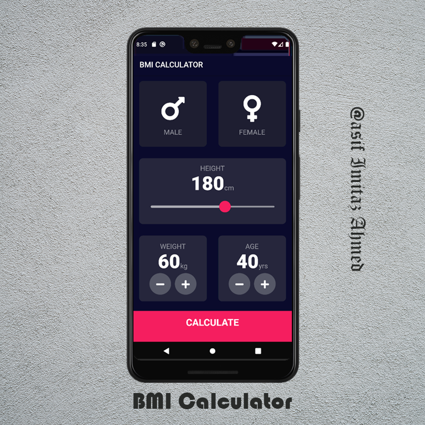 This app calculates your Body Mass Index (BMI) according to height weight, age and gender.